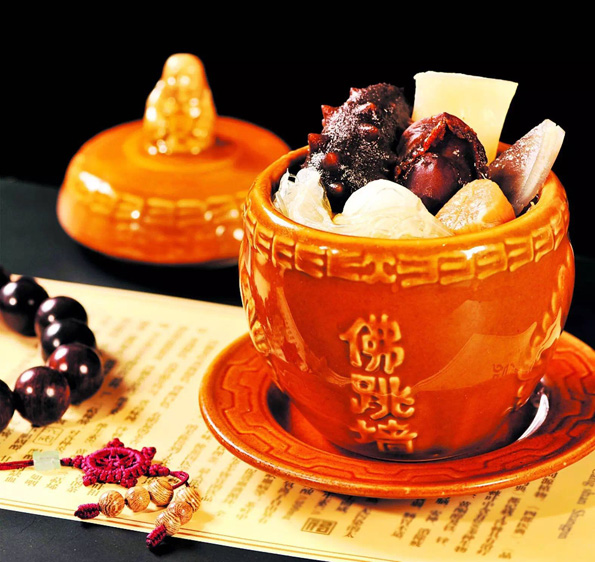 也稱“福壽全”,是用豬肚、雞鴨、羊肉、鴿蛋以及海產(chǎn)品等10多種材料,一起裝進(jìn)紹興酒壇,然后煨制而成。一開酒壇,滿室幽香,個中滋味,回味無窮。