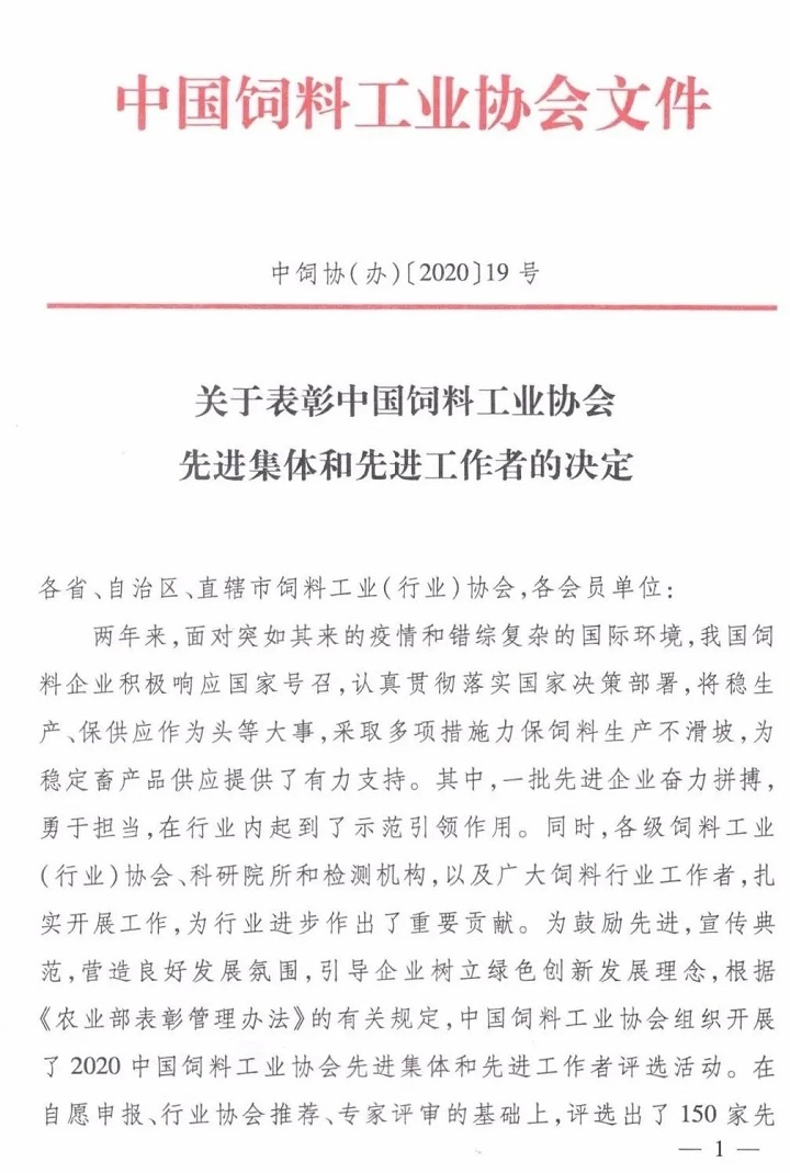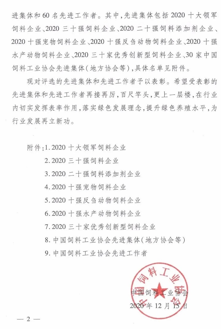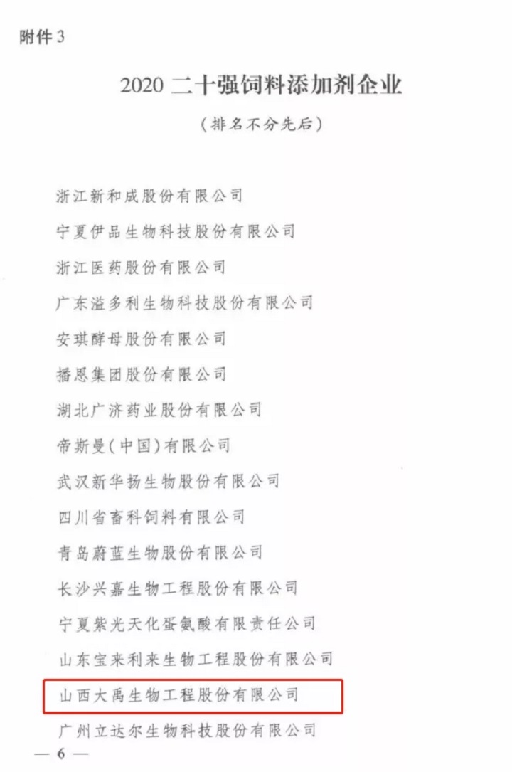 【喜訊】大禹生物榮獲2020全國二十強(qiáng)飼料添加劑企業(yè)稱號