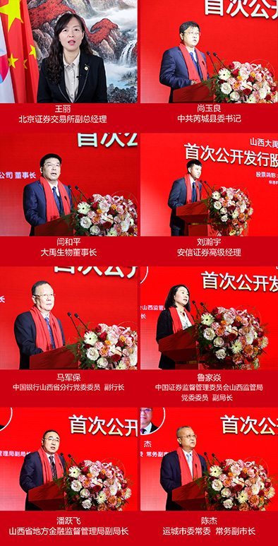 同時(shí),還有大禹生物股東代表、董事、監(jiān)事、高管代表、特邀代表,中介機(jī)構(gòu)、客戶代表、員工代表,以及在大禹生物發(fā)展過(guò)程中予以我們支持、幫助、合作的各界伙伴,人民日?qǐng)?bào)、新華社、中央電視臺(tái)、上海證券報(bào)、證券時(shí)報(bào)、山西日?qǐng)?bào)、山西電視臺(tái)、山西新聞網(wǎng)等媒體的記者朋友。北京證券交易所副總經(jīng)理王麗女士通過(guò)視頻連線發(fā)來(lái)祝賀。