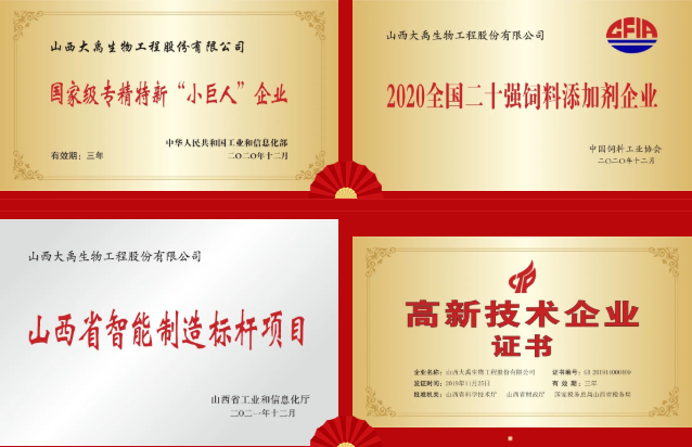大禹生物成立于2014年,主營(yíng)業(yè)務(wù)為飼料添加劑、飼料及獸藥的研發(fā)、生產(chǎn)與銷售。先后榮獲國(guó)家級(jí)專精特新“小巨人”企業(yè)、全國(guó)二十強(qiáng)飼料添加劑企業(yè)、山西省智能制造標(biāo)桿項(xiàng)目、山西省質(zhì)量獎(jiǎng)提名獎(jiǎng)、山西省企業(yè)技術(shù)創(chuàng)新獎(jiǎng)等榮譽(yù)。