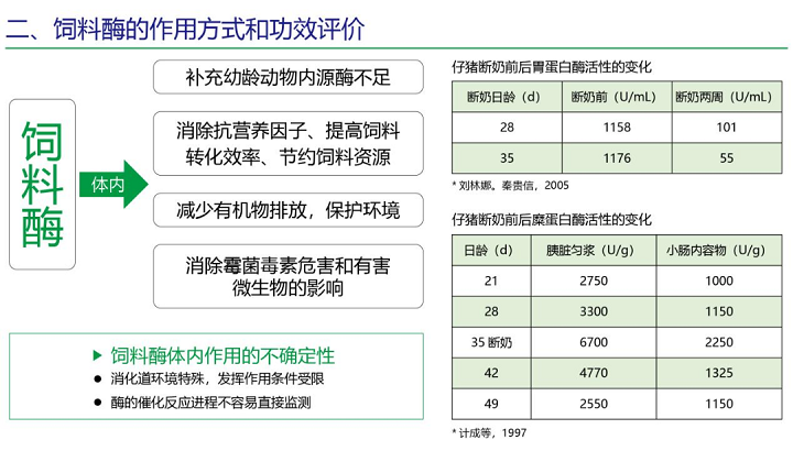 飼料酶在體內可以補充幼齡動物內源酶不足、消除抗營養因子、提高飼料轉化效率、節約飼料資源、減少有機物排放,保護環境、消除體內霉菌毒素危害和有害微生物的影響。